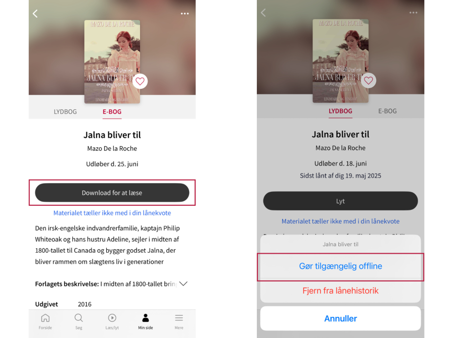Du får nu mulighed for at fjerne den downloadede titel. Den forsvinder ikke fra dine lån, og du kan stadigvæk høre den online. E-bøger skal dog downloades for at kunne blive læst.